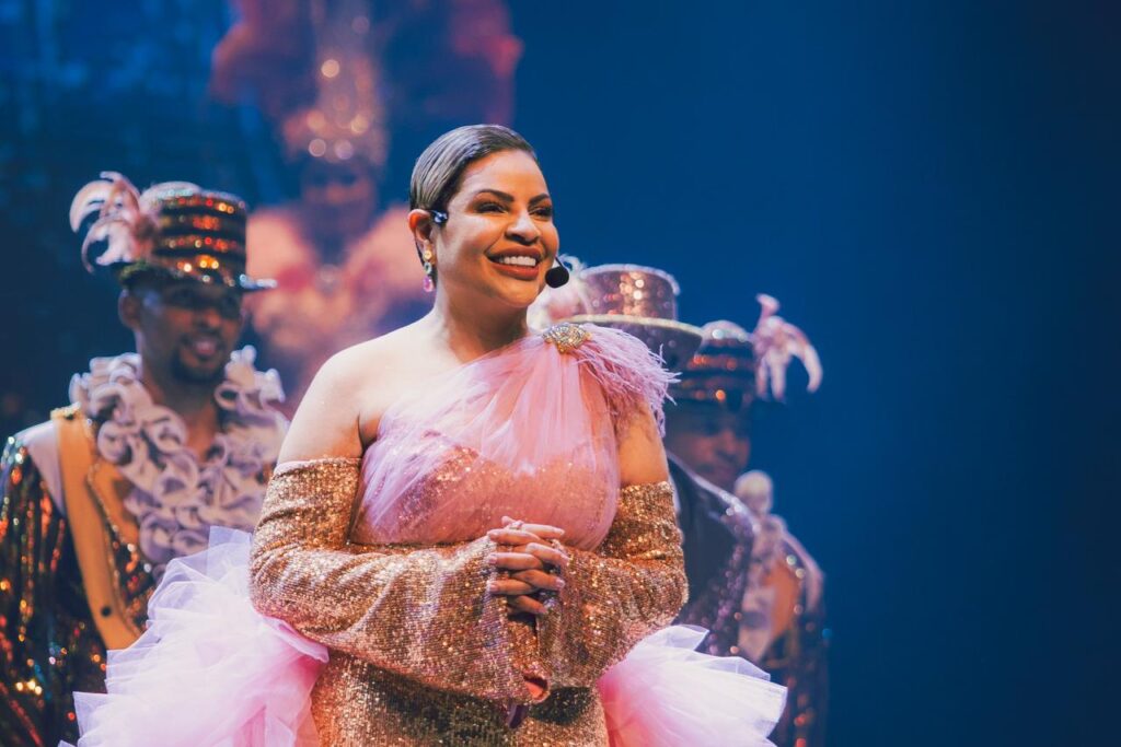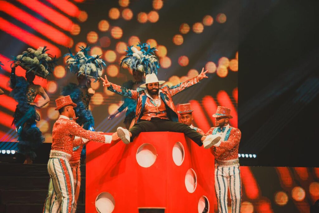 La González abrió el show con un número de baile, subida en un sol, y de inmediato comenzó con el primer invitado, el cantante Kriish, seguido de una reseña sobre su exitosa trayectoria.
